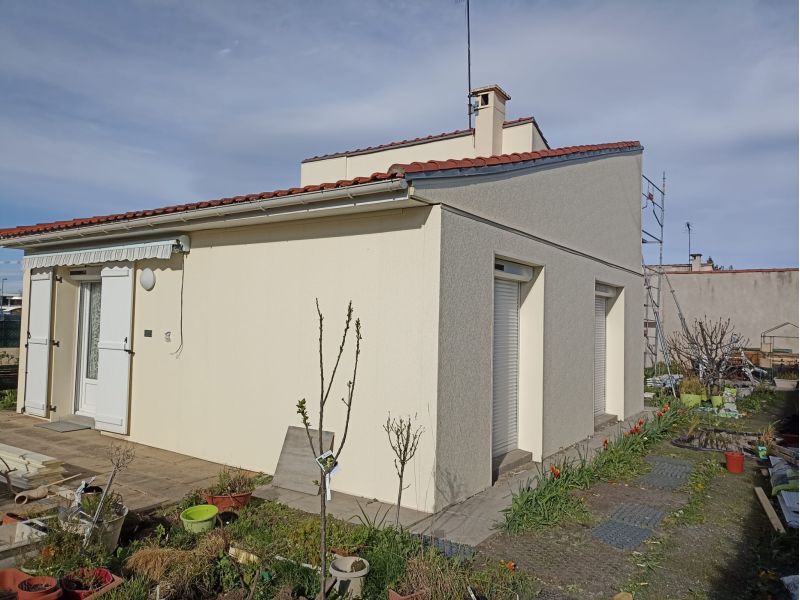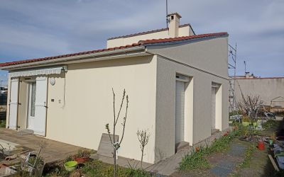 Chantier d’isolation par l’extérieur d’une maison complète, en panneaux Uniso 85mm avec finition Crépi de couleur : Tuffeau Blond.